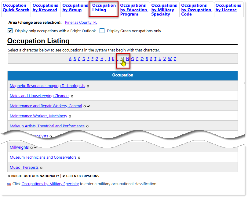 Select this link to navigate to the Occupation Listing search tab, where you can choose from an alphabetical list of all occupations. |