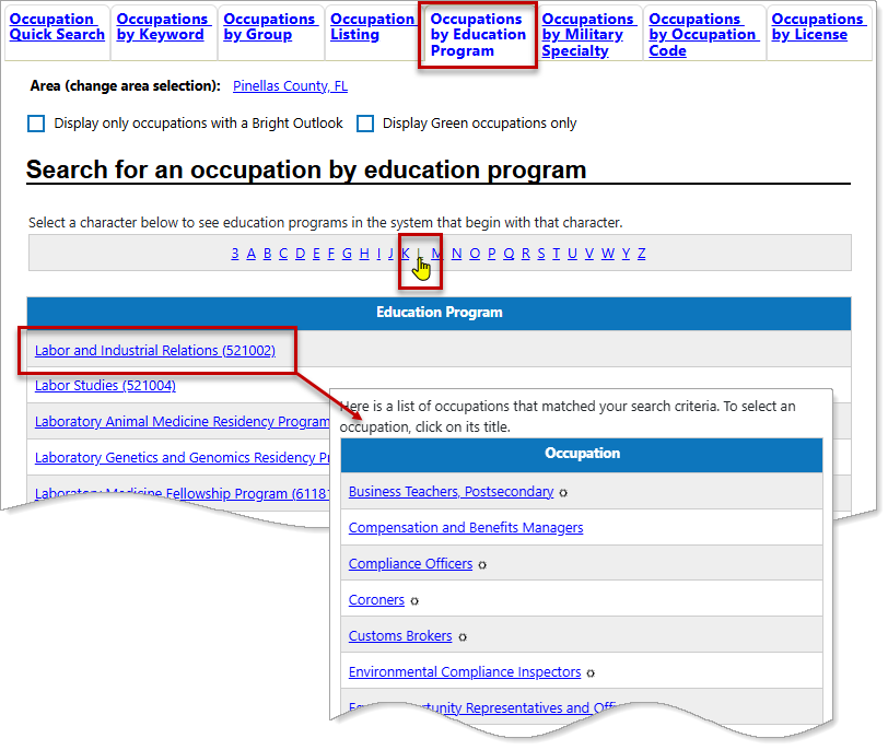 Use this tab to search for Occupations by Education Program. Select any of the Education Program links to view the occupations associated with the selected program. Use the letter links at the top to navigate through the alphabet for programs beginning with a specific letter.