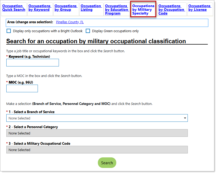 Use this tab to search for an occupation by military occupational classification. The system offers three methods for searching for an occupation: keyword search, MOC code (Military Occupational Classification), or select from a series of drop-down lists to search by Branch, Category and MOC.