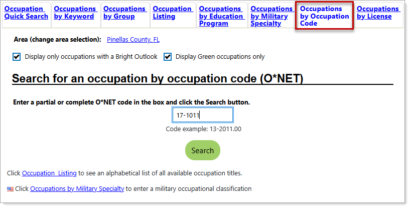This tab allows you to search for an occupation using an occupation code. The Occupational Information Network (O*NET) database gives every occupation a unique code number. You must know the complete or partial code number of the occupation you wish to search for.