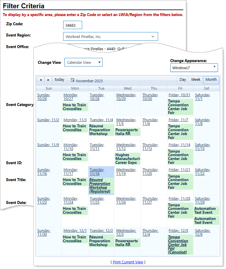 The Events Calendar lets you explore upcoming opportunities in your area, including events that offer online registration, such as training classes or job fairs. When you first open it, the Events Calendar displays events for the current month filtered for the workforce office associated with your location. You can refine your search using the provided filter criteria to find the events that meet your needs.