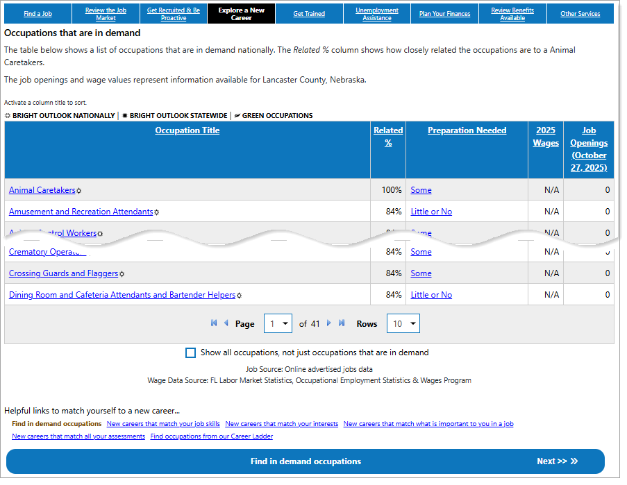 To see other career list options, use the "Helpful links to match yourself to a new career..." links below the table. Select any one of them or select the Next button to step through the links and automatically change the information display.