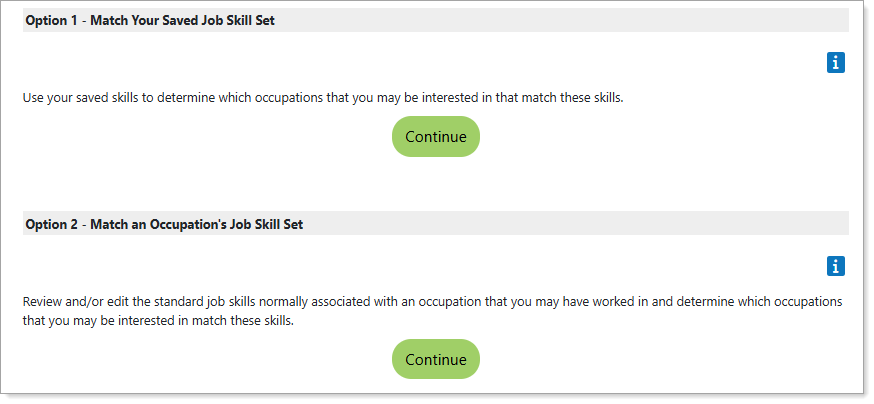 Option 1 uses your saved job skills to identify occupations that align with your abilities and interests.