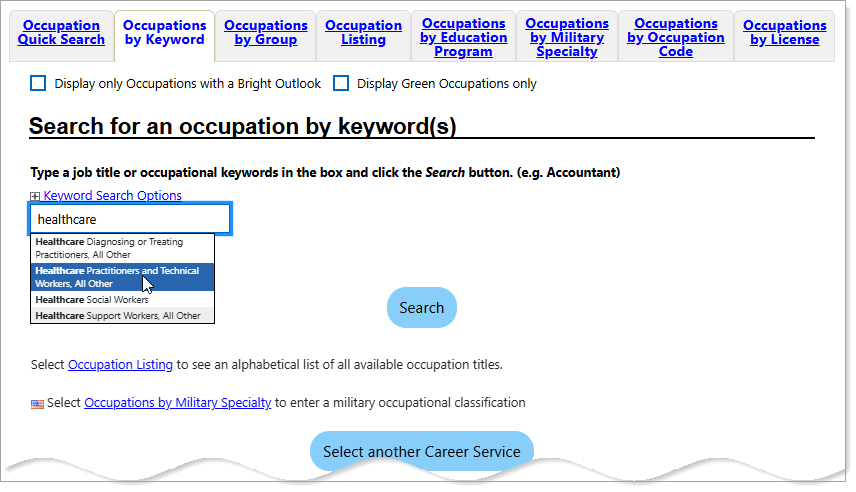 On the Occupation Search screen, select the Occupations By Keyword tab.