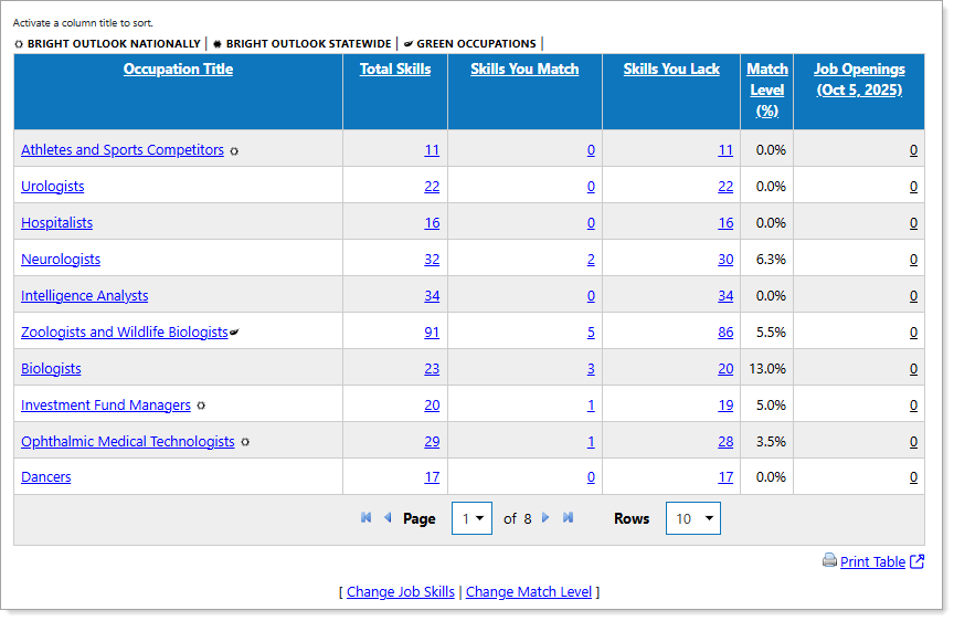 Select an occupation from the list and then select the Search button to view the Occupational Skill Matches.