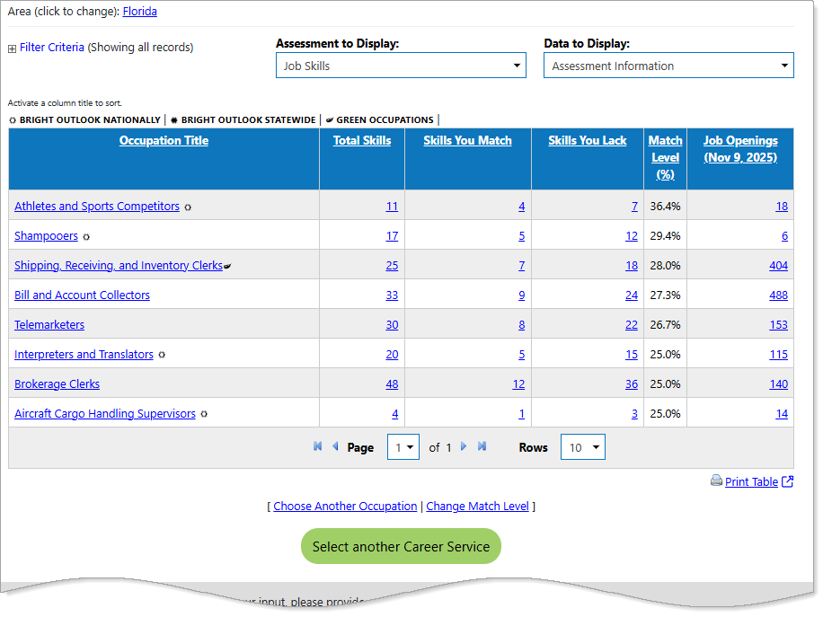 Total Skills, Skills You Match, Skills You Lack columns show how your abilities compare. Select any link to view the related skill list. For example, if you selecting a link under Skills You Match for Air Traffic Controllers displays skills you already possess for that occupation. |