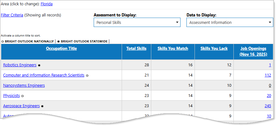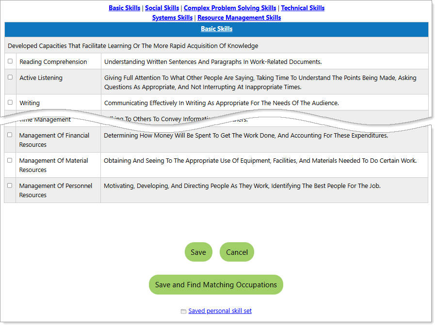 The Personal Skills assessment lets you create or edit a list of your personal skills. Skills are grouped by category and include a brief description for each. You can use your saved skills to find matching jobs and occupations.