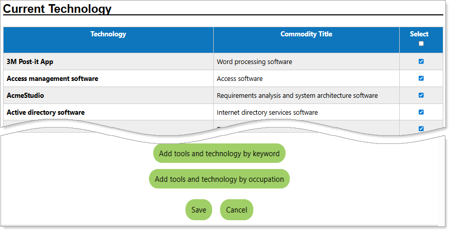 Select the items you want using the checkboxes, and then select the Add these tools and technology button to save them. The Current Tools and Technology page redisplays.