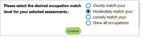 Choose a match level for your assessment: Closely, Moderately, Loosely, or Show all occupations and select the Continue button. If your results are too narrow, select the Change Match Level link below the results grid and select a broader match level.