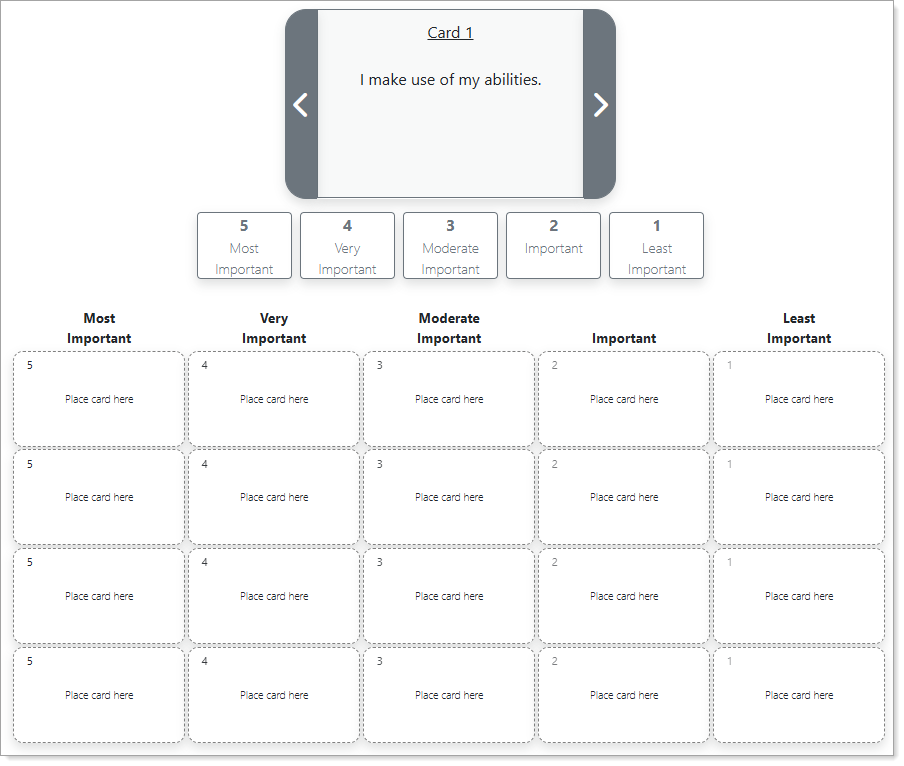 Sort each card according to your preferences using the following rankings: Most Important, Very Important, Moderate Important, Important, or Least Important.
