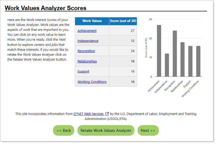 On the Work Values Analyzer Scores page, each work value receives a score up to 30, with higher scores indicating greater importance.