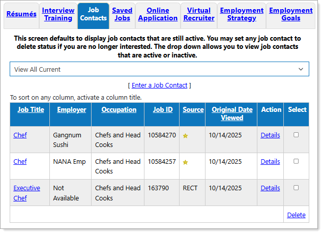 Directory of Services tab > Services for Individuals > Job Seeker Services icon > My Saved Jobs icon > Job Contacts tab