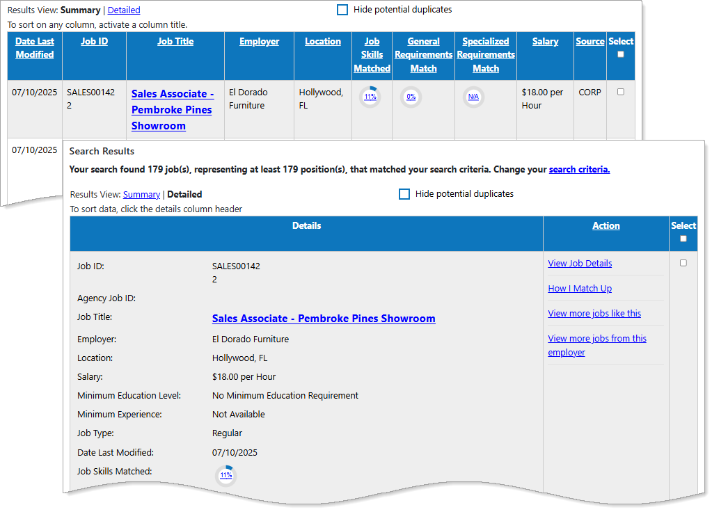 After running an Intelligent or Skills job search, your results can be viewed in either a Summary or Detailed format. The Summary view offers a quick, high-level look at each job, while the Detailed view provides additional information at a glance. Both views include common controls to help you navigate and manage your results.