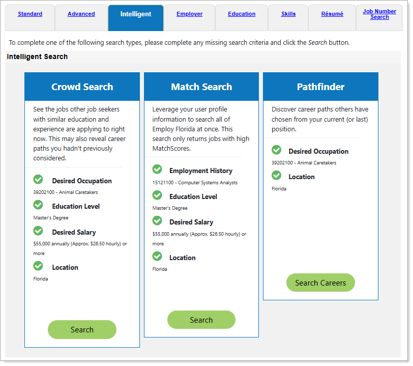 The Intelligent tab on the Job Search Options page lets you search for jobs based on your background information, using patterns from other individuals’ job searches to suggest opportunities that closely match your skills and experience. You can choose from three intelligent search methods: Crowd Search, Match Search, and Pathfinder. Each method is designed to help you discover opportunities you might not have thought to search for on your own.