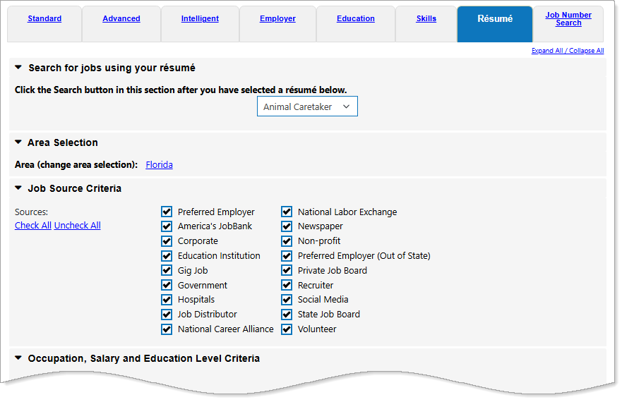 Select the desired active résumé from the drop-down list. Additional search criteria sections display automatically for Area, Job Source, Desired Occupation, Salary, and Education Level.