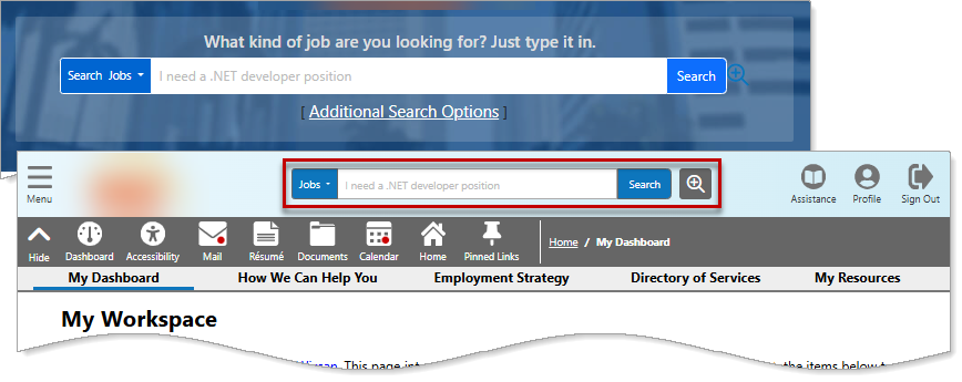 The Quick Job Search feature lets you perform basic job searches by keyword and area. It is available in the header bar at the top of every page and on the site splash page before you sign in.