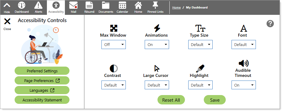 The Accessibility Controls panel lets you set your display preferences and save them for easier viewing of text and controls in the system.