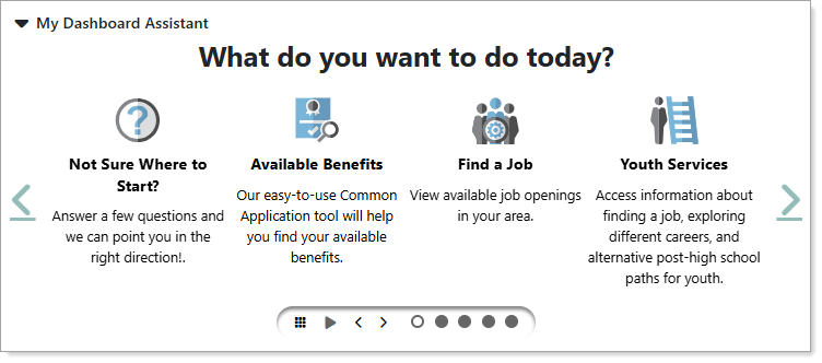 The system is a robust platform offering a wide range of services to meet the needs of many different users. With so many features, links, widgets, and resources available, it’s easy to feel overwhelmed at first. The Not Sure Where to Start? tool gets you pointed in the right direction by assessing your needs and goals with a short questionnaire and providing personalized recommendations for services, programs, and benefits based on your responses.