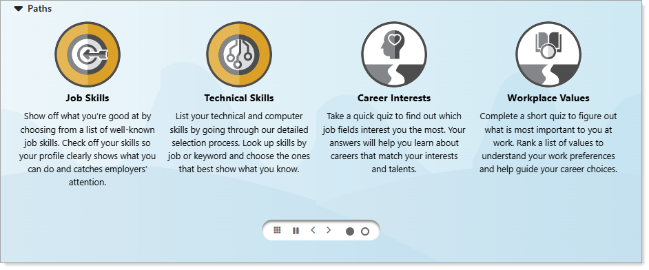 The Paths section allows you to see at-a-glance areas in the system that you can complete to become designated as a savvy job seeker in the eyes of hiring employers. These areas, or “paths,” include things like your background information, a résumé, and several types of self-assessments. As you complete each path, its badge icon changes from gray to colored. Once you complete all seven paths, you earn a ‘Smart Seeker’ designation icon