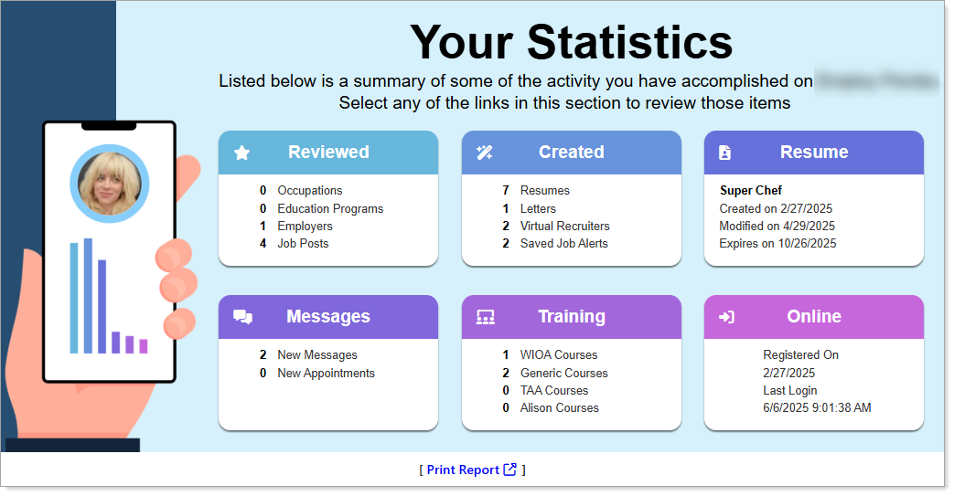 Your Statistics tracks key education, training, and job hunting activities. You can view detailed information about the corresponding activity by selecting links in the cards; for example, selecting the Résumés number link on the Created card opens the Résumés tab of your Employment Plan Profile.