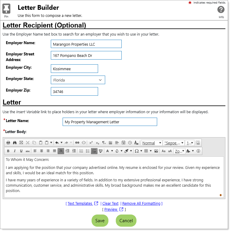 The Correspondence tab lets you create, modify, and save letters you can use for different purposes. For example, you can create cover letters, and later attach them to résumés and send them as part of completing online job applications.