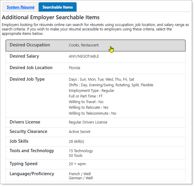 Employers and recruiters can search for résumés in the system using a variety of criteria, including occupation, job location, salary range, keywords, and more. The more details you provide in your profile, the higher your chances of appearing in relevant search results.