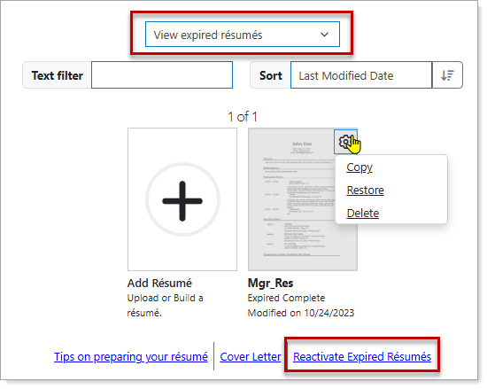 Copy — Use the expired résumé as a starting point for a new résumé. See Copy a Résumé for details.