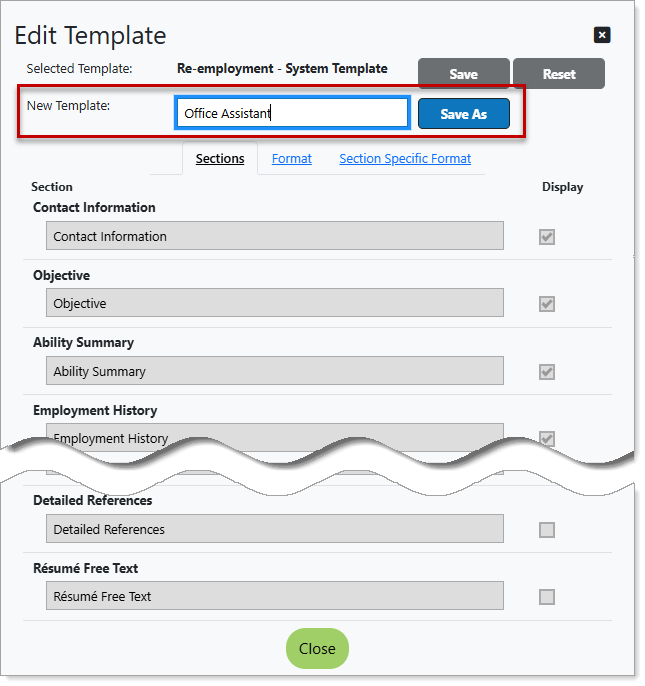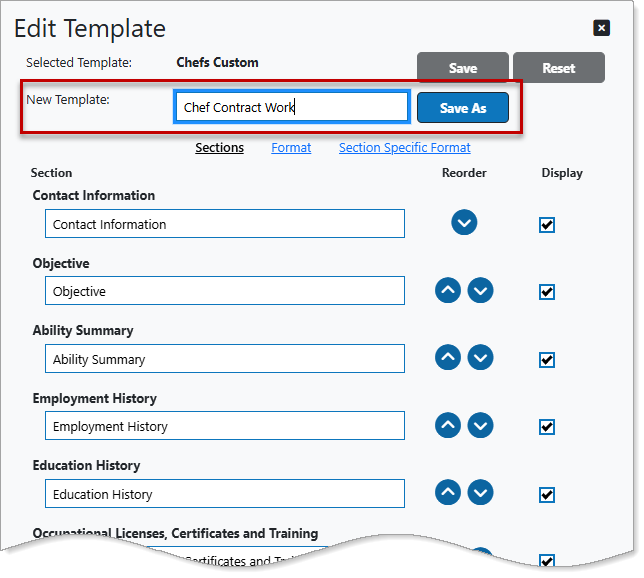 Change the format and content (as described below) and select the Save button at the top of the page to save your custom résumé template.