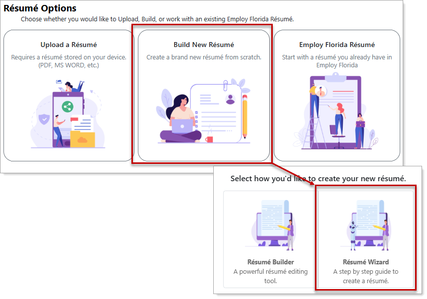 The Résumé Wizard is a step-by-step tool that helps you easily build a résumé. Think of it as a guided form that collects your information (work history, education, skills, etc.) and formats it into a top-notch résumé that employers can easily search and view.
